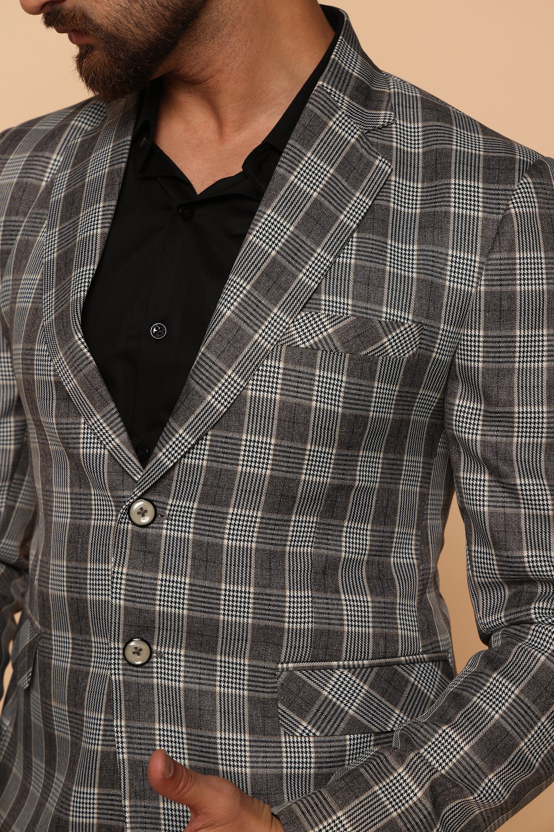 Choose this classy Checks Blazer from Offkings, Grey & black checked slim-fit formal blazer, has a notched lapel, long sleeves, single-breasted with button closure, and 2 flap pockets & 1 chest pocket